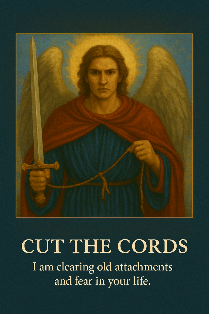 The card is a call to release and cleanse yourself from past attachments, toxic relationships, and emotional fears that are holding you back. The angel is actively working to cut these energetic cords for you, helping you reclaim your personal power, clarity, and peace.
