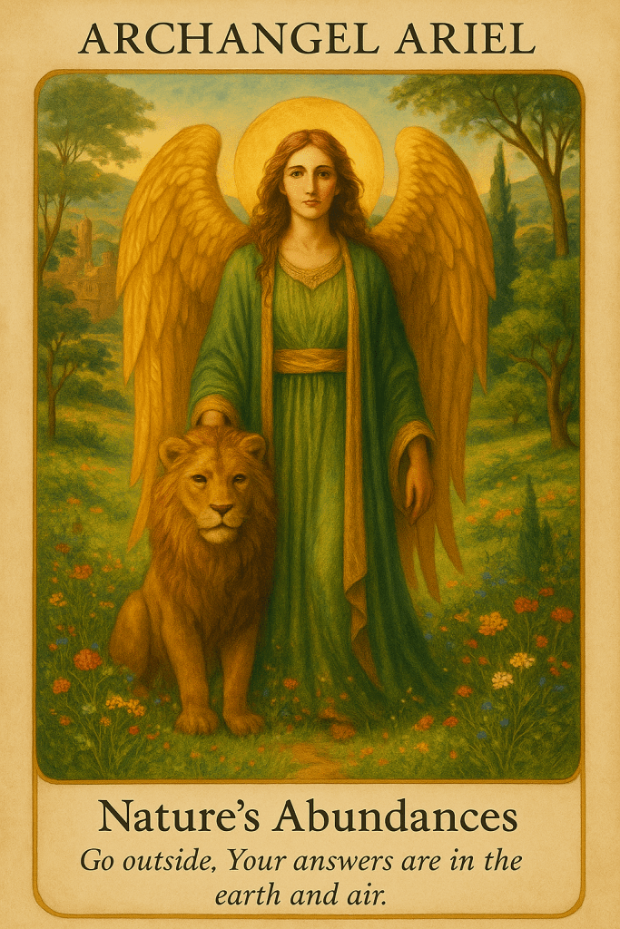 Archangel Ariel is the angel of nature, abundance, and courageous action. Her name means “Lioness of God,” and she is known for her fierce yet loving energy, often appearing with a lion to symbolize strength and guardianship. Ariel helps us connect deeply with the Earth, align with natural abundance, and manifest our dreams through practical and spiritual means. She empowers you to pursue your divine mission boldly, reminding you that the universe supports those who act with purpose and heart.