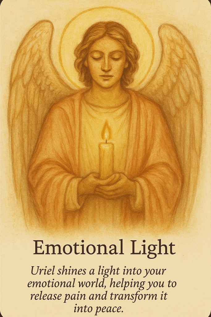 The message of the “Emotional Light” card is a gentle call to illuminate your inner world with compassion and clarity. Uriel invites you to acknowledge your emotions without judgment, to bring hidden pain into the light, and to let healing begin. Emotional wounds lose their power when seen through the lens of love and understanding. This card assures you that peace is possibleโnot by suppressing what you feel, but by embracing it with awareness and allowing light to dissolve the darkness within.